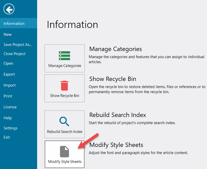 To manage the style sheets of a project, click on "Modify Style" under "File"/"Information" area.