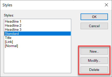 Using the buttons on the right you can edit existing styles, create new styles and delete unwanted ones. Changes will directly affect all texts whose format is defined by the respective style sheet.