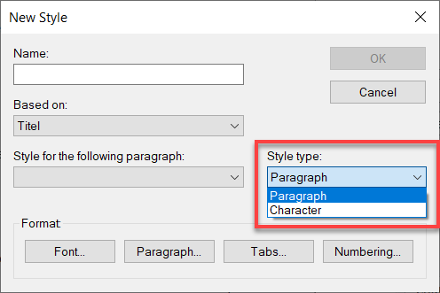For new style sheets, you can choose between two types. The "Paragraph" type always formats the entire paragraph, the "Character" type only formats specified character(s).
