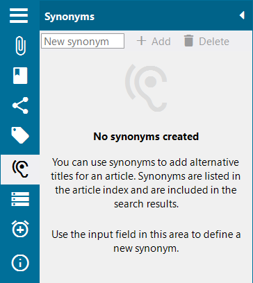 To additionally manage an article under a synonym, you can enter a synonymous name in the context area of an article and delete it if applicable.