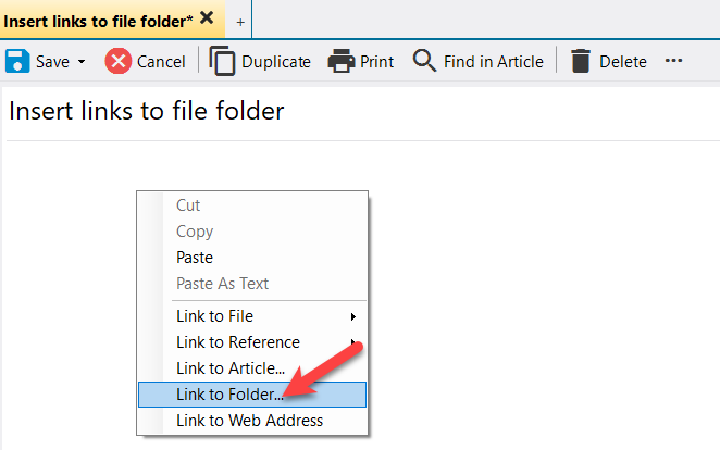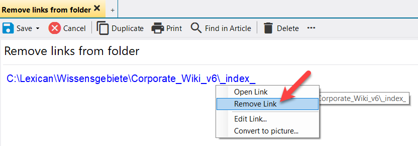 To edit the link to a folder, we recommend deleting the folder and inserting a new link. To delete, take the article in editing and click on "Remove link" in the pull-down menu (right mouse button).