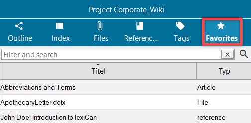 lexiCan allows the definition of "favorites" i.e. the marking of an article, a file or a reference as favorite content of a project - similar to bookmarks in a web browser. These favourites are listed in a separate area within the navigation. In this way, particularly important or frequently used content can be reached more quickly.