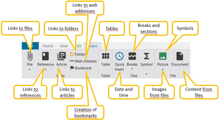 Also, the function bar "Insert" does not become visible until an article is in edit mode. It provides various ways to insert content and links into an article.