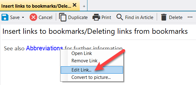 If you have set a link to free text, you may want to change the link and define a different destination for the link. In this case, edit the article and select "Edit link".