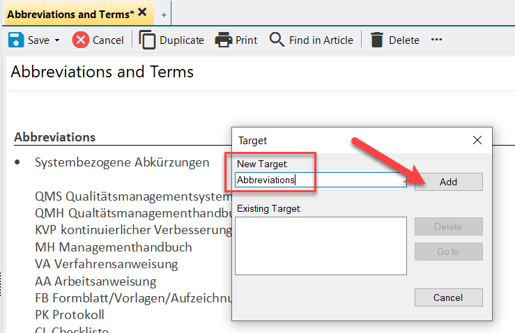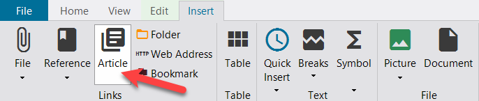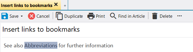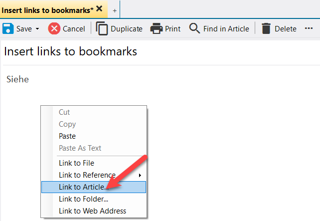 Select the article in which you want to insert a link to a bookmark and put it in edit mode. The article of the bookmark and the article into which the link is to be inserted can be identical. Place the cursor where you want the link to appear or select the text for the link. Then click on "Article" in the "Insert" function bar.