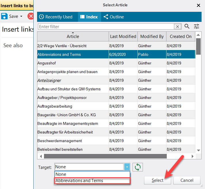 lexiCan then opens a dialog window. Use the different views "Recently used", "Index" and "Outline" to select the article in which you have inserted the corresponding bookmarks and click on the small button to load the bookmarks of the article.
