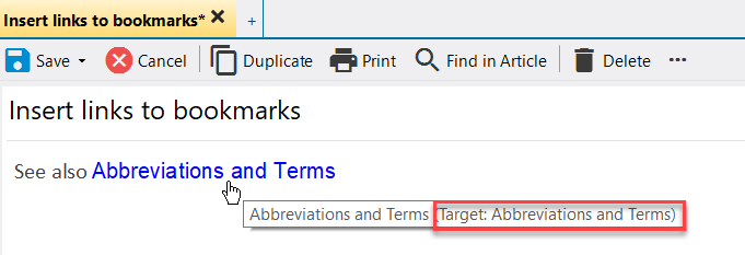 After selecting the correct bookmark and confirming the selection, the link is inserted, which will take you directly to the bookmark with a mouse click in the future (for information on the functionality of links while editing an article, please refer to the article Using Links). lexiCan inserts the name of the bookmark article, the bookmark itself is displayed in brackets in the tooltip as soon as you place the mouse pointer over the link, e.g.