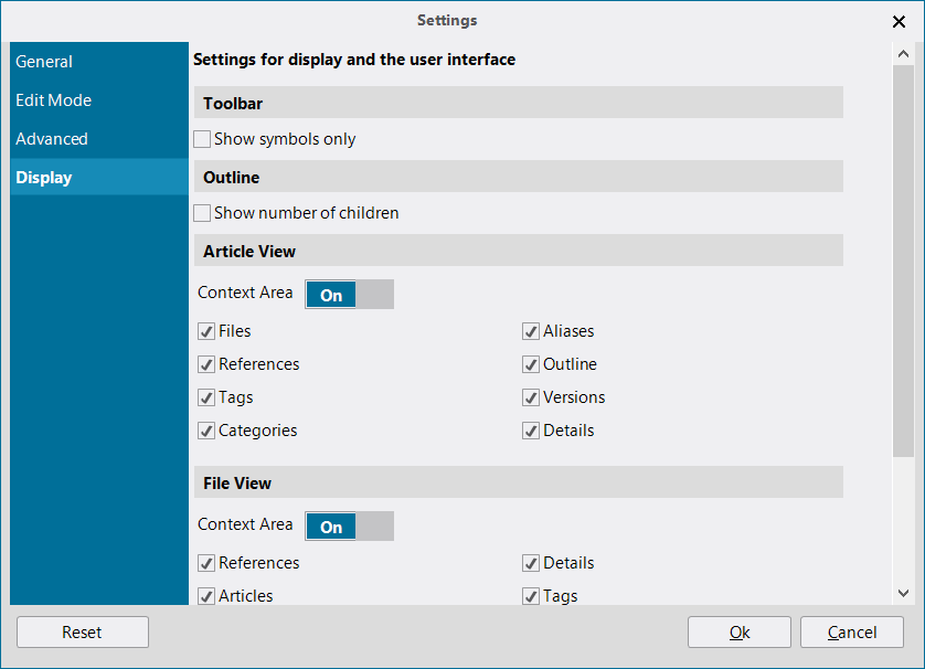 customize the display of the context area for articles, files and references, e.g. hide certain areas
