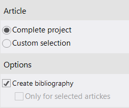In the right-hand pane, specify whether you want to export the entire project or only parts of it ("Custom Selection"). If you have defined references and assigned them to articles, you can also export them. They are then displayed as a footnote in the respective article.