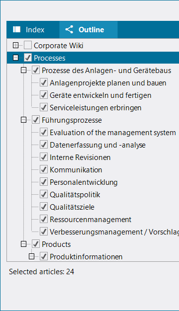 If you like to export only parts of the project ("Custom Selection"), a selection window will open after the start, where you can choose between the index view and the outline ("Gliederung") view.