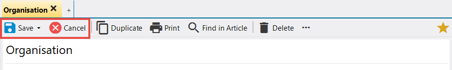 To save the article or cancel the process, click on "Save" or "Cancel" in the function bar of the article.