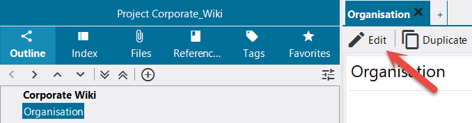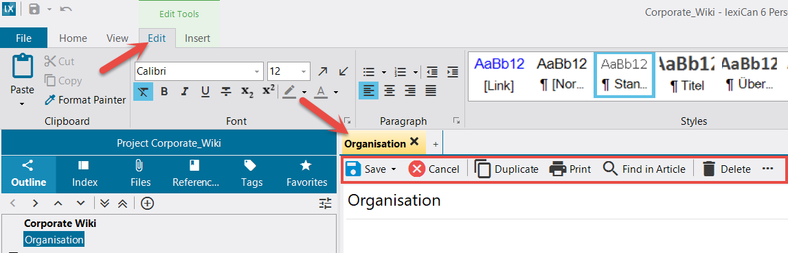 Select the article via Index or Outline and click on "Edit" in the toolbar of the article.