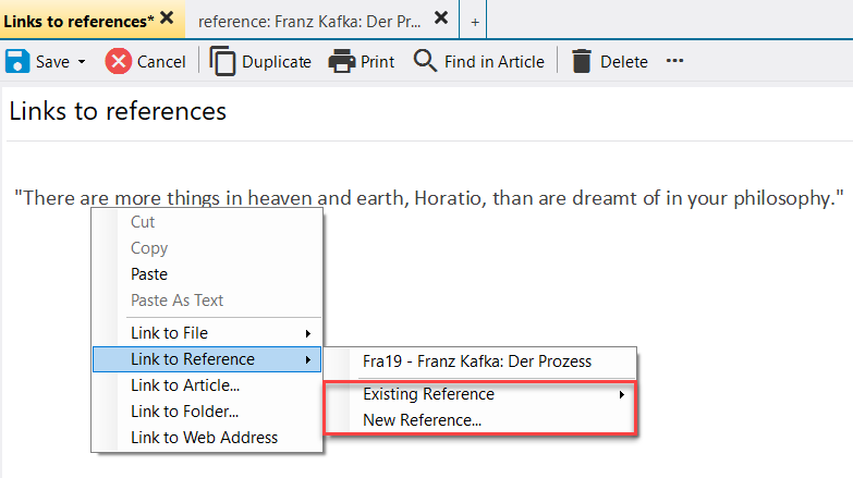 Edit the article in question, place the cursor at the point in the article where the links are to be inserted or select the text passage that is to carry the link. Then open the context menu (right mouse button) and click on "Link to Reference". Using the sub menu you can then choose between "Existing Reference and "New Reference".