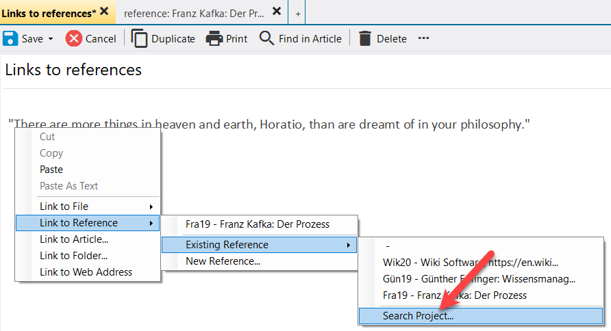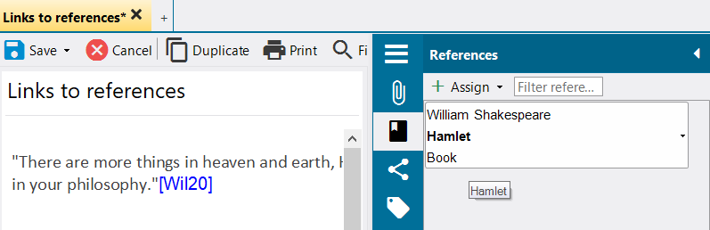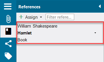 Regardless of whether the reference is new or already in the project, it is listed in the context area under "References" after a link is entered, e.g.
