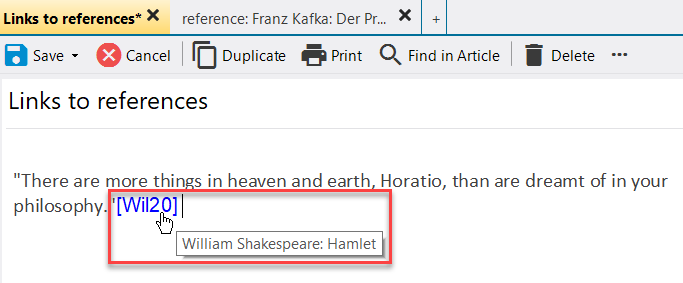 After entering all necessary data and confirmation, lexiCan inserts the desired reference (source code), e.g.