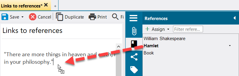 You can also go the other way round, i.e. you can assign one or more references to an article using the context area and then set the links in the article using drag'n drop, e.g.